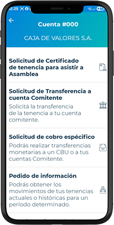 Si tenés cuentas en el Registro Escritural de Caja de Valores, podés realizar distintos trámites desde la app. Entre ellos: cobros específicos, transferencia a cuenta comitente, vinculación de apoderados, pedidos de información (saldos y movimientos), certificado para asambleas y transferencias entre cuentas del registro.